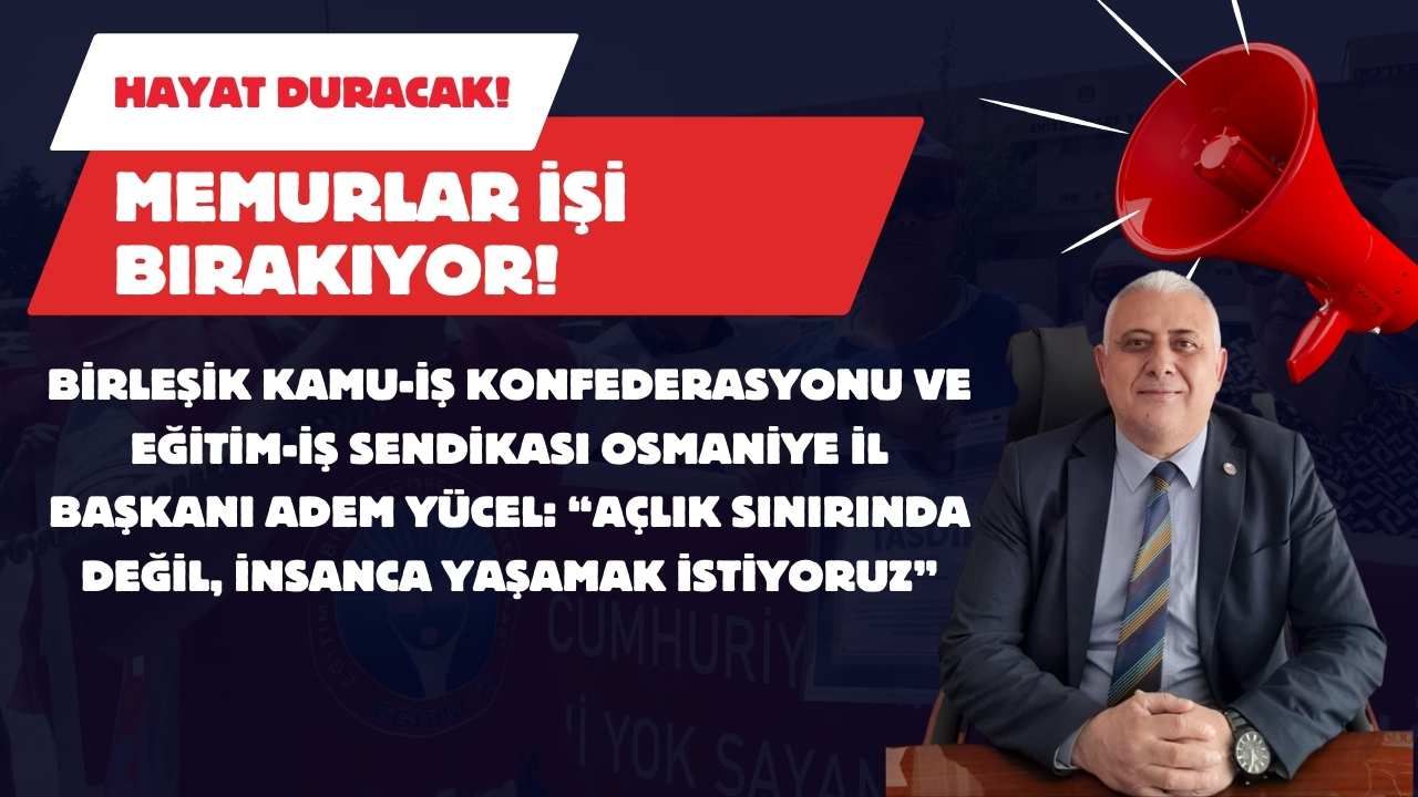 Birleşik Kamu-İş Konfederasyonu ve Eğitim-İş Sendikası Osmaniye İl Başkanı Adem Yücel, 19 Aralık’ta ülke genelinde yapılacak iş bırakma eylemine ilişkin sert ve dikkat çekici açıklamalarda bulundu. Yücel, maaş ve ücretlerin yüksek enflasyon karşısında hızla eridiğini, kamu emekçilerinin ve emeklilerin açlık sınırına doğru sürüklendiğini söyledi. TÜİK’in açıkladığı enflasyon rakamlarının, vatandaşın mutfakta yaşadığı gerçeklikle örtüşmediğini vurgulayan Yücel, “Biz rakamlarla değil, pazardaki fiyatlarla yaşıyoruz” ifadelerini kullandı. Ekonomi politikalarının bedelinin emekçilere ödetildiğini dile getiren Yücel, bu nedenle 19 Aralık’ta üretimden gelen güçlerini kullanarak iş bırakacaklarını belirtti.