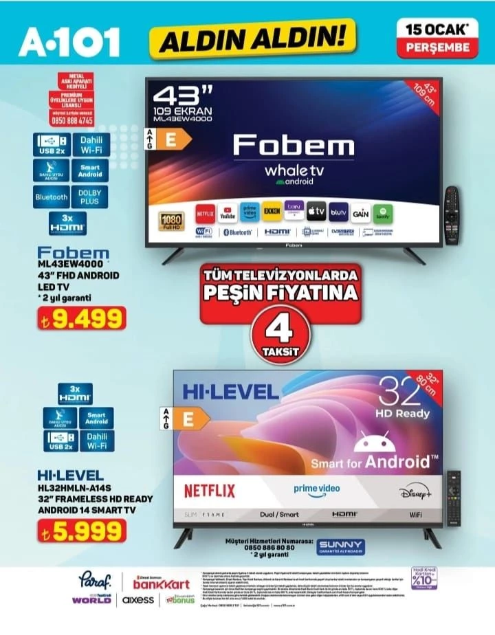 Kataloğun en çok ilgi gören bölümünü bu hafta teknolojik cihazlar oluşturuyor. Uygun fiyatlı televizyon arayışında olanlar için iki farklı Android model satışa sunulacak. FOBEM markalı 43 inç FHD Android LED TV 9 bin 499 liradan, daha kompakt bir seçenek olan HI-LEVEL 32 inç Frameless HD Ready Android 14 Smart TV ise 5 bin 999 liradan alıcı bulacak.