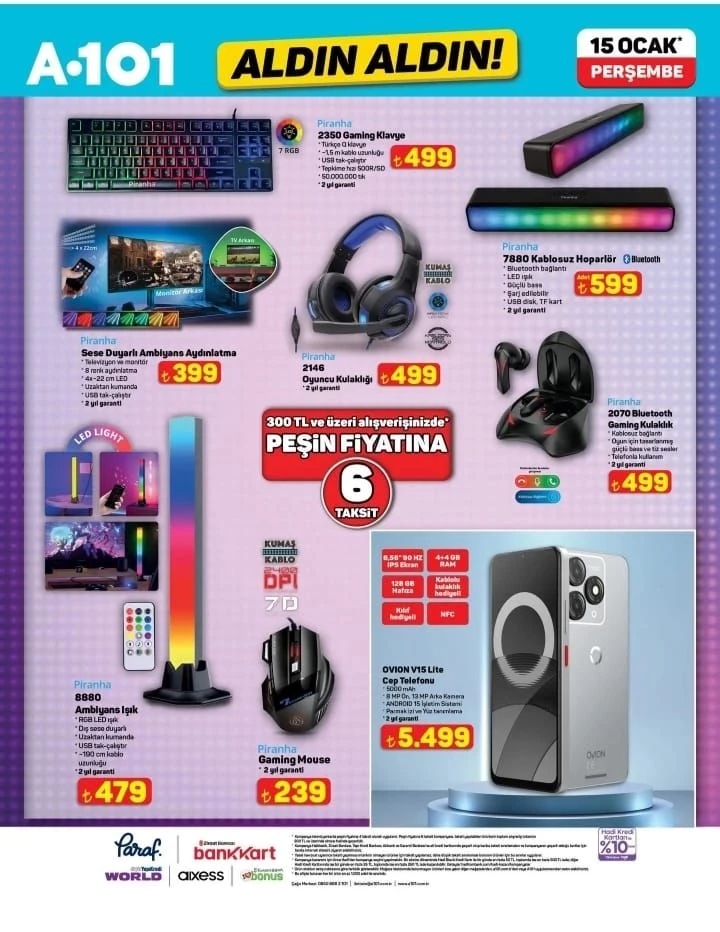 Teknoloji köşesinde oyuncular da unutulmadı. Piranha Gaming Klavye 499 lira, oyun atmosferini değiştirmek isteyenler için sese duyarlı ambiyans aydınlatma ise 399 lira etiket fiyatıyla raflardaki yerini alacak.