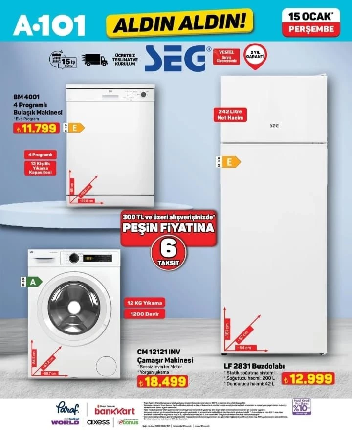 Evini yenileyenler veya çeyiz dizenler için beyaz eşya grubunda SEG markalı ürünler öne çıkıyor. 4 programlı bulaşık makinesi 11 bin 799 lira, çamaşır makinesi ise 18 bin 499 liradan satışa sunulacak.