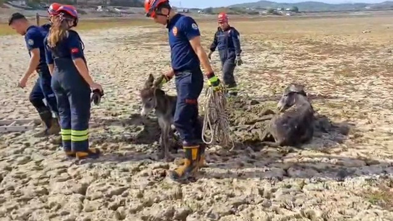 Kuraklığın etkisiyle suların büyük ölçüde çekildiği Seyhan Baraj Gölü'nde, çamura saplanan bir eşek itfaiye ekiplerinin zamanında müdahalesiyle kurtarıldı. Yaşananlar, hayvan sevgisinin ve ekiplerin fedakarlığının güzel bir örneğini sergiledi.