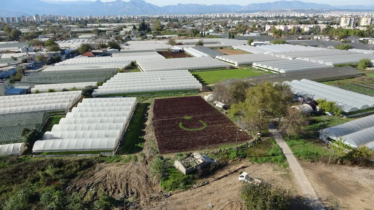 Çiftçiler, kırmızı ve yeşil yapraklı toplam 13 bin marulu özel bir düzenlemeyle dikerek Türk bayrağının hilal ve yıldız şeklini tarlaya başarıyla yansıttı.