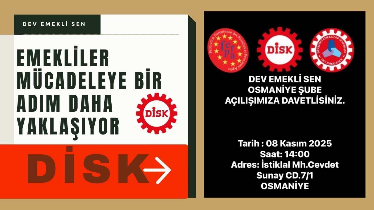 Devrimci İşçi Sendikaları Konfederasyonu’na (DİSK) bağlı olarak faaliyet yürüten Devrimci Emekliler Sendikası (Dev Emekli-Sen), Osmaniye'deki örgütlenmesini tamamladı. Şubenin açılışı 8 Kasım 2025 Cumartesi günü saat 14.00’te, İstiklal Mahallesi Cevdet Sunay Caddesi No:7/1 adresinde gerçekleşecek. Tören, tüm halkın katılımına açık olacak.