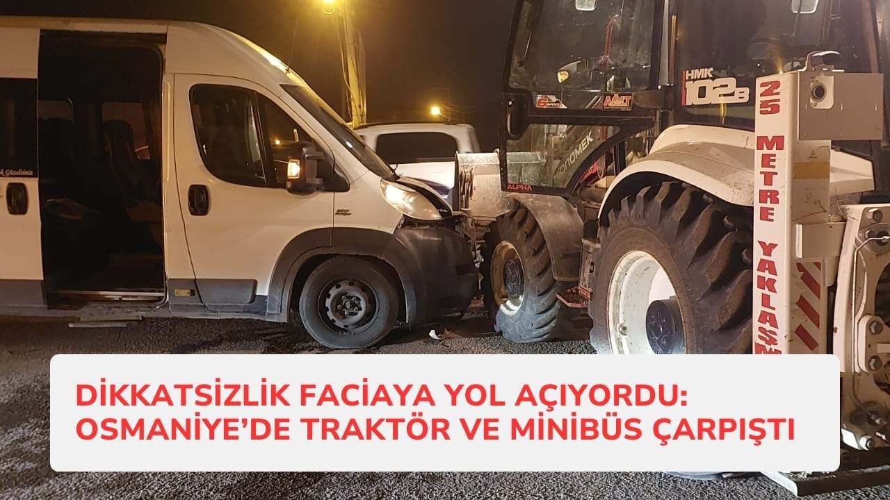 Osmaniye-Kadirli yolu üzerinde, otogar istikametindeki alt geçit çıkışında traktör ile minibüs çarpıştı. Kaza, Dumlupınar Mahallesi ile Yunus Emre Mahallesi kavşağı yakınlarında meydana geldi. Çarpışmanın etkisiyle minibüs bir süre savrulurken, çevrede kısa süreli panik yaşandı. İhbar üzerine olay yerine polis ekipleri sevk edildi.