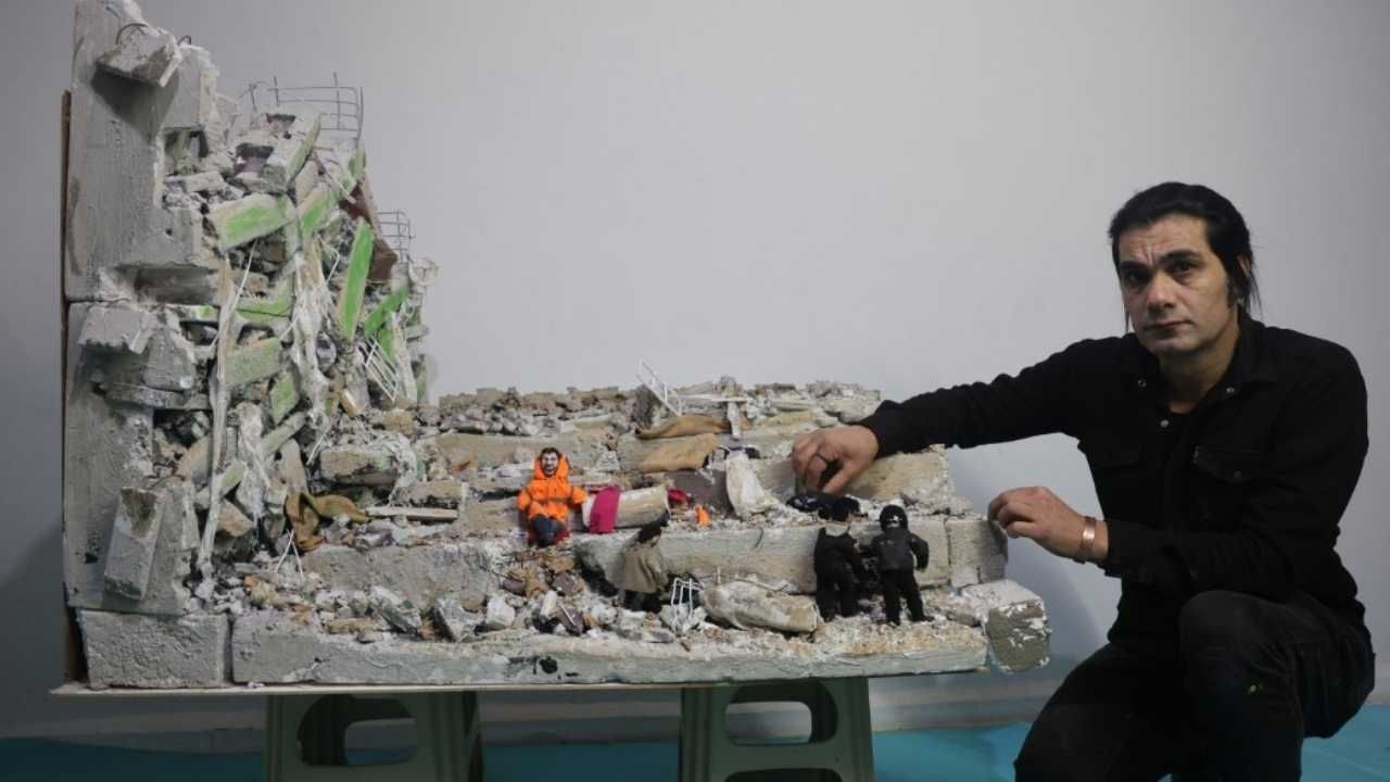 Hatay’ın Altınözü ilçesinde yaşayan minyatür sanatçısı Mehmet Kocaman, 6 Şubat depremlerinde enkaz altında kalan kızının elini bırakmayan Mesut Hançer’den etkilenerek anlamlı bir çalışmaya imza attı. Kocaman, asrın felaketi olarak anılan depremde yaşanan acıları minyatür sanatına taşıdı.