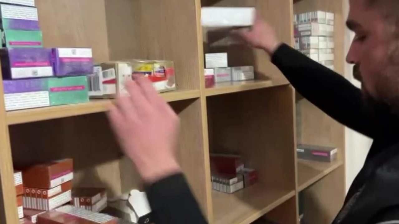 Evde yapılan aramalarda vitrin ve çeşitli bölümlerde saklanan 5 bin 500 paket kaçak ısıtılmış sigara, 102 elektronik sigara ve 15 kaçak alkollü içki ele geçirildi.