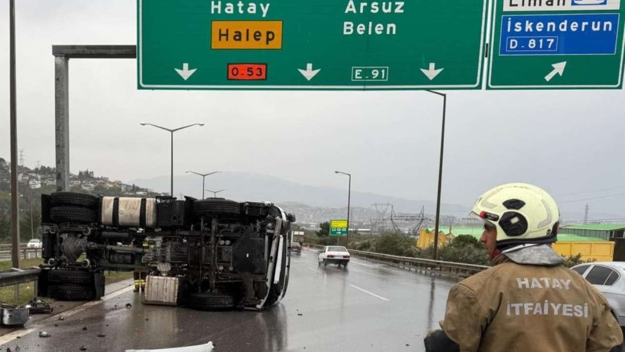 İskenderun ilçesi Akçay Mahallesi mevkisinde, kayganlaşan zeminde kontrolü kaybeden bir tırın devrilmesi sonucu araç sürücüsü yaralandı.