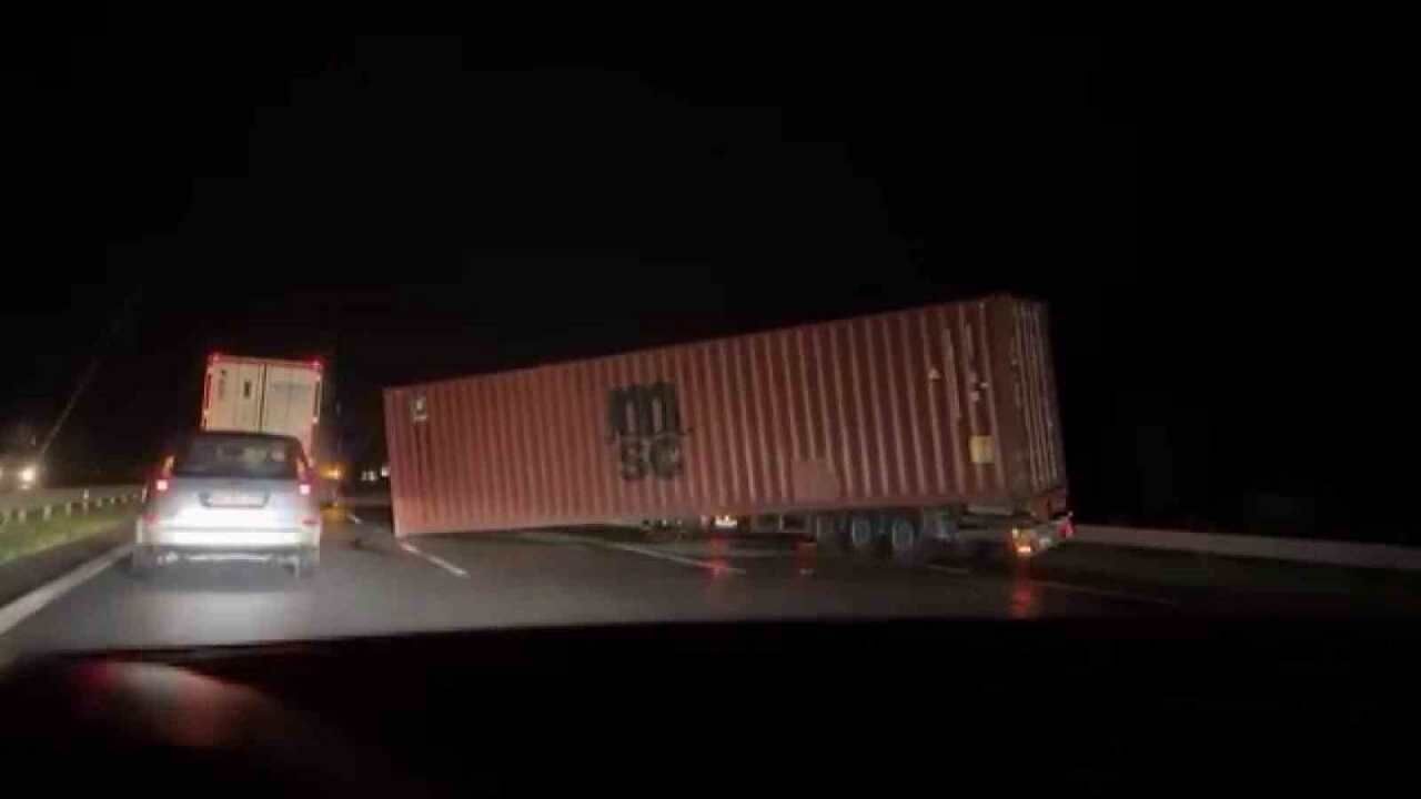 Fırtınanın en tehlikeli anlarından biri de otoyolda yaşandı. Şiddetli rüzgarın etkisiyle seyir halindeki bir tırın taşıdığı yük konteyneri yerinden çıkarak yola devrildi. Otoyol üzerinde trafik akışını etkileyen bu olayda şans eseri yaralanan olmazken, tırda ve konteynerde hasar oluştu.