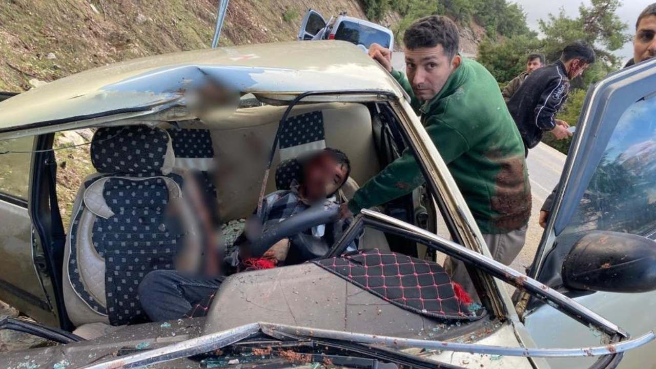 Yol kenarındaki yamaçta çalışma yapan bir kepçenin hareketiyle yerinden kopan devasa bir kaya parçası, hızla yola yuvarlanarak Muhammed E. idaresindeki aracın ön camından içeri girdi. Metrelerce yüksekten düşen kayanın etkisiyle hurdaya dönen araçta bulunan sürücü Muhammed E., komşusu İsmail D. ve sürücünün iki kardeşi yaralandı.