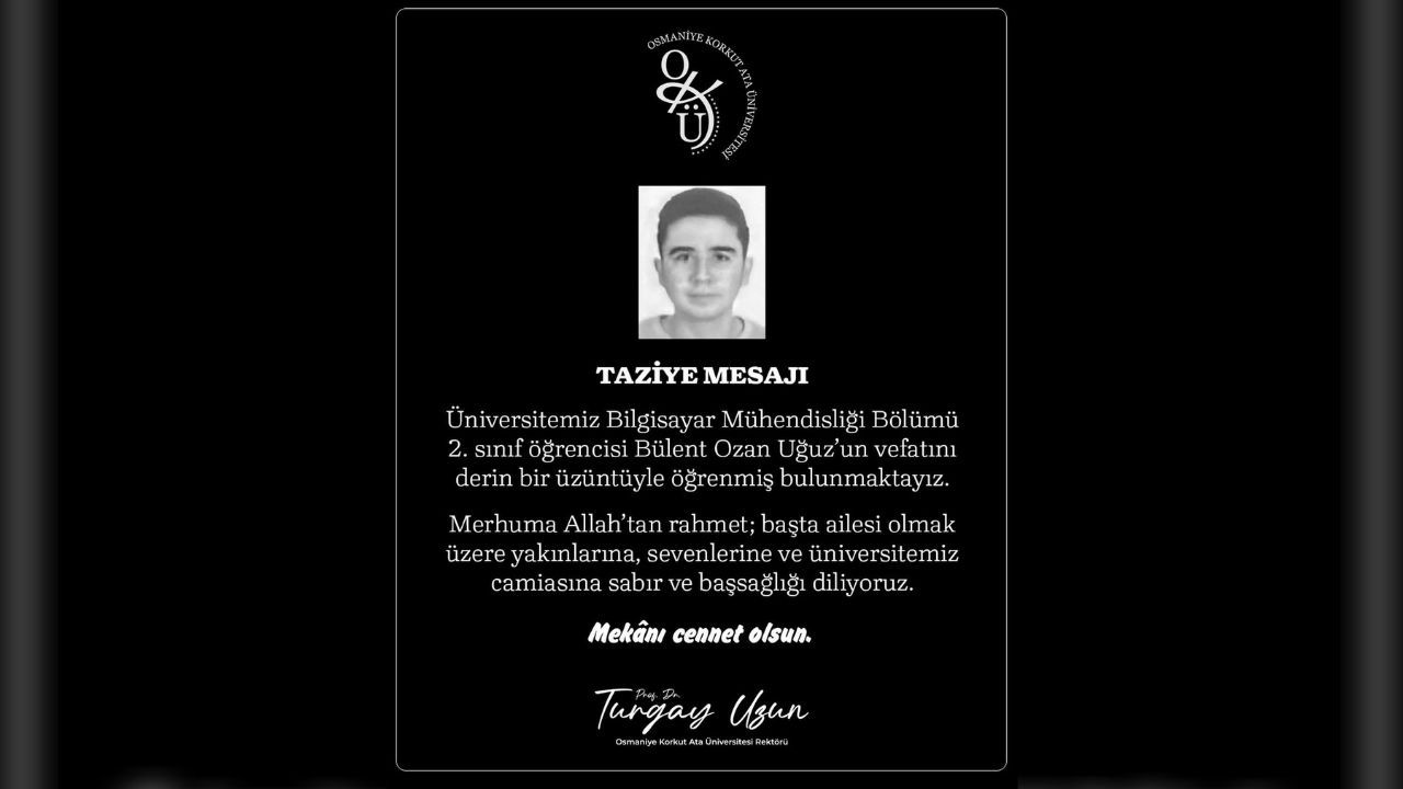 Osmaniye Korkut Ata Üniversitesi (OKÜ) Bilgisayar Mühendisliği Bölümü 2. sınıf öğrencisi Bülent Ozan Uğuz’un hayatını kaybetmesi, ailesi, arkadaşları ve üniversite camiasında büyük üzüntüye neden oldu. Genç öğrencinin vefat haberi sonrası OKÜ yönetimi de taziye mesajı yayımladı.