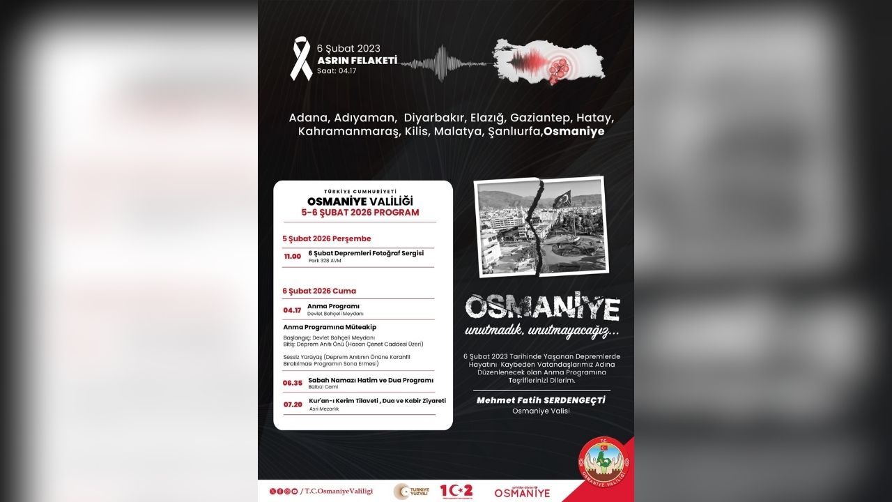 Osmaniye Valiliği tarafından açıklanan programa göre anma etkinlikleri 5 Şubat 2026 Perşembe günü başlayacak. Günün ilk etkinliği saat 11.00’de Park 328 AVM’de açılacak olan 6 Şubat Depremleri Fotoğraf Sergisi olacak. Sergide, depremlerin ilk anlarından itibaren yaşananlar, kurtarma çalışmaları ve dayanışma örnekleri fotoğraflarla anlatılacak.