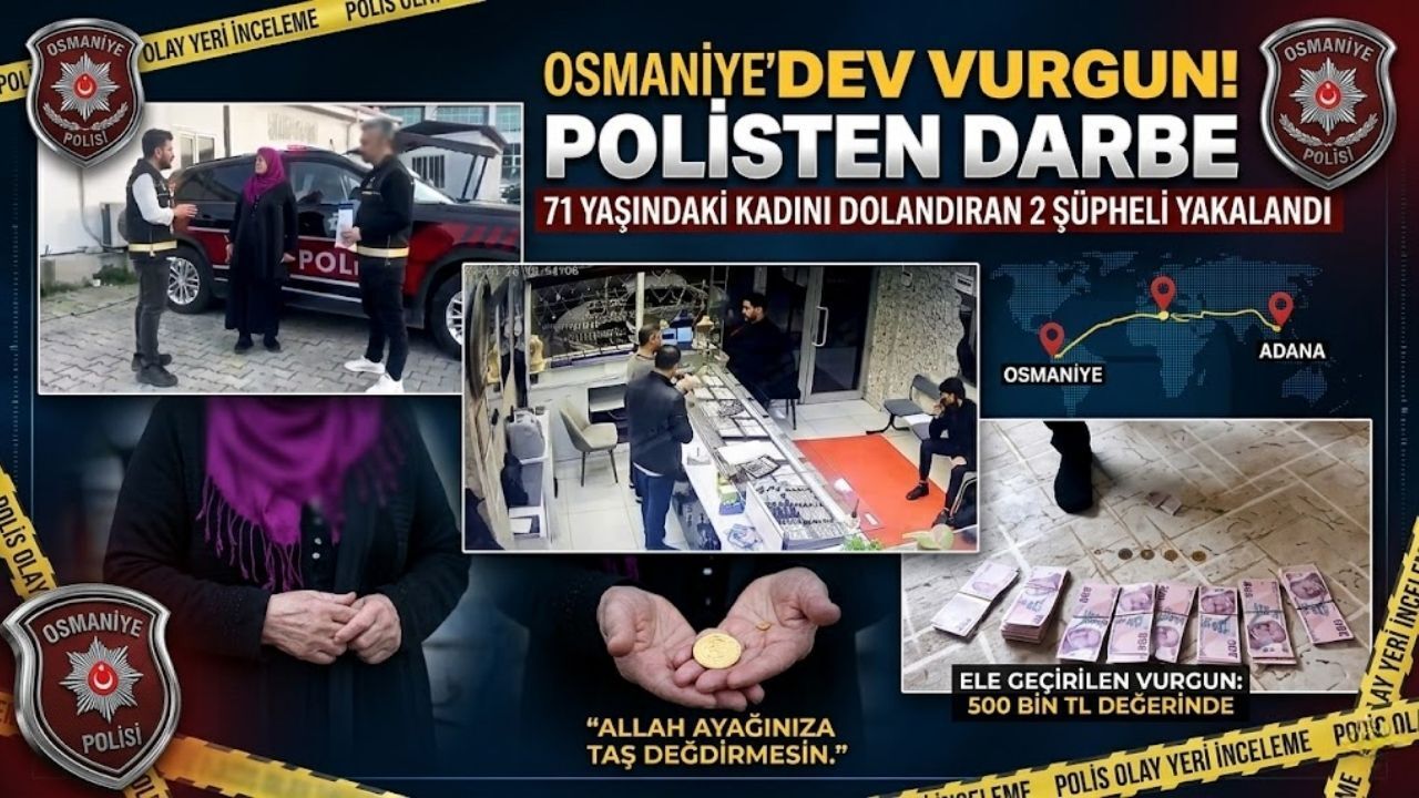 Olay, Osmaniye merkezde meydana geldi. Mağdur E.Y.’yi (71) telefonla arayarak ikna eden dolandırıcılar, yaşlı kadının evine giderek altın ve paraları elden teslim aldı. İhbar üzerine harekete geçen Asayiş Şube Müdürlüğü ekipleri, bölgedeki onlarca güvenlik kamerasını saniye saniye inceledi.
