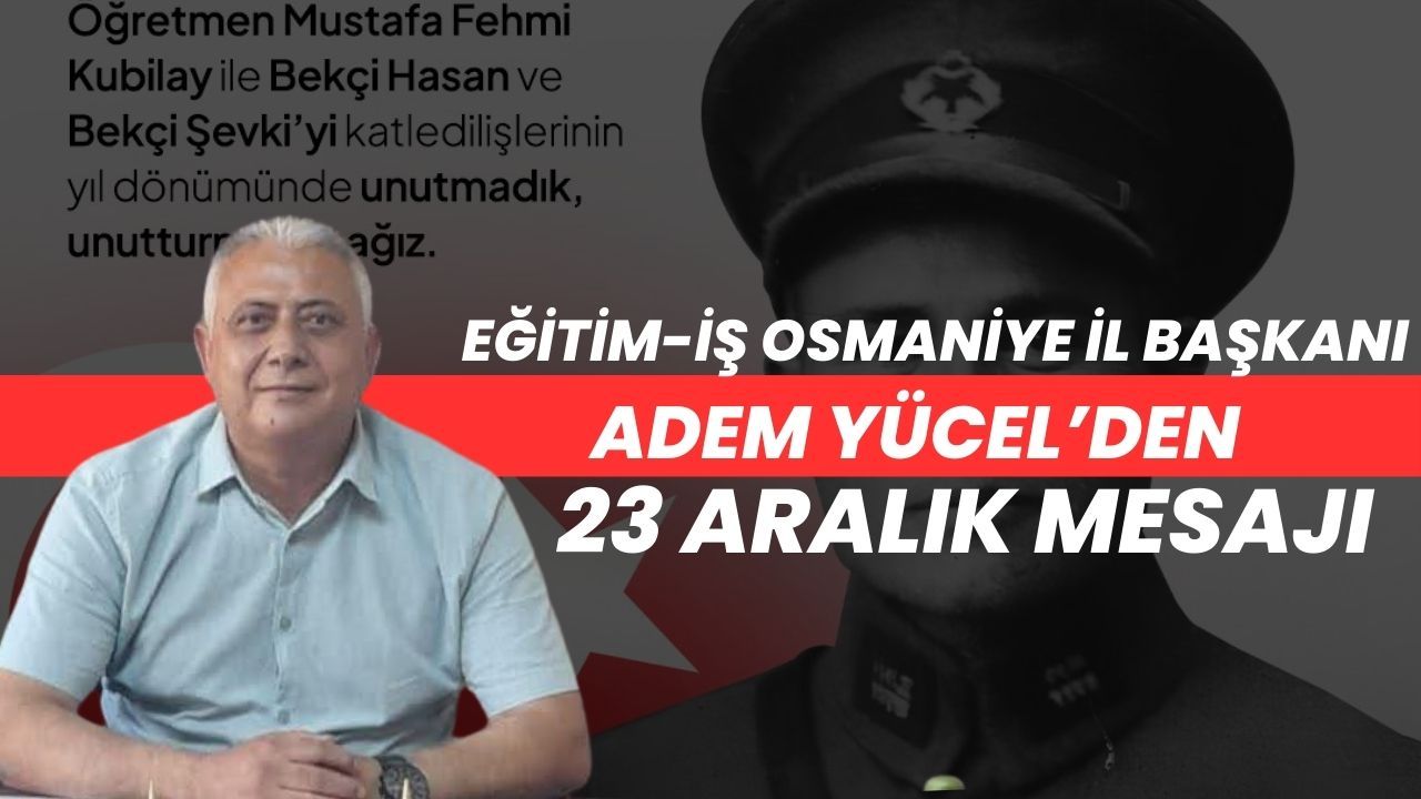 Eğitim ve Bilim İşgörenleri Sendikası (Eğitim-İş) Osmaniye İl Başkanı Adem Yücel, 23 Aralık 1930’da gerçekleşen Menemen Olayı ve Asteğmen Mustafa Fehmi Kubilay’ın şehit edilişinin yıl dönümü nedeniyle bir basın açıklaması yaptı. Yücel, açıklamasında laiklik vurgusu yaparak, Cumhuriyet devrimlerine yönelik saldırılara karşı sessiz kalmayacaklarını belirtti.