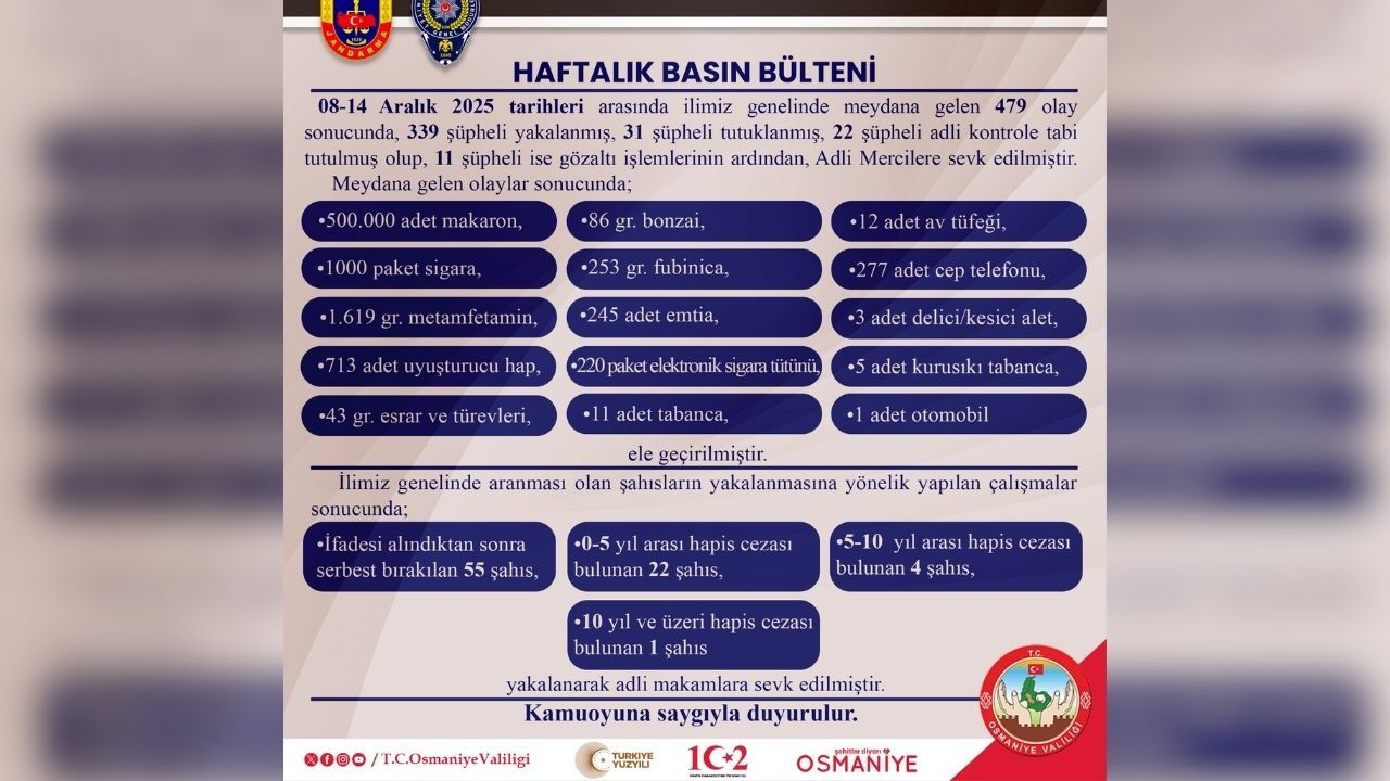 Osmaniye genelinde güvenlik güçleri tarafından yürütülen çalışmaların 08-14 Aralık 2025 tarihlerini kapsayan haftalık sonuçları kamuoyu ile paylaşıldı. Açıklanan verilere göre, il genelinde meydana gelen 479 olay kapsamında 339 şüpheli yakalandı. Yapılan işlemler sonucunda 31 şüpheli tutuklanırken, 22 şüpheli adli kontrol şartıyla serbest bırakıldı. Ayrıca 11 şüpheli, gözaltı işlemlerinin ardından adli mercilere sevk edildi. Güvenlik birimlerinin, suç ve suçlularla mücadele kapsamında sahadaki etkin çalışmalarını aralıksız sürdürdüğü vurgulandı.