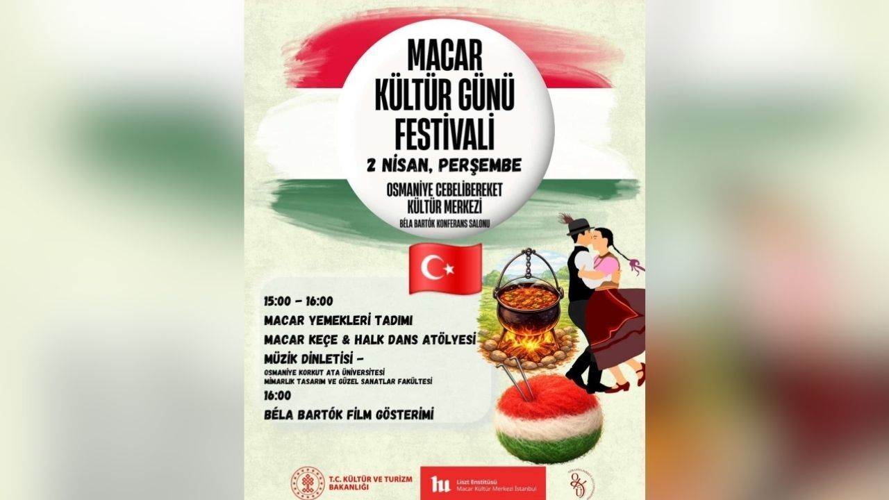 T.C. Kültür ve Turizm Bakanlığı, Macar Kültür Merkezi (Liszt Enstitüsü) ve Osmaniye Korkut Ata Üniversitesi iş birliğiyle düzenlenen Macar Kültür Günü Festivali, Cebelibereket Kültür Merkezi’nde gerçekleştirilecek.