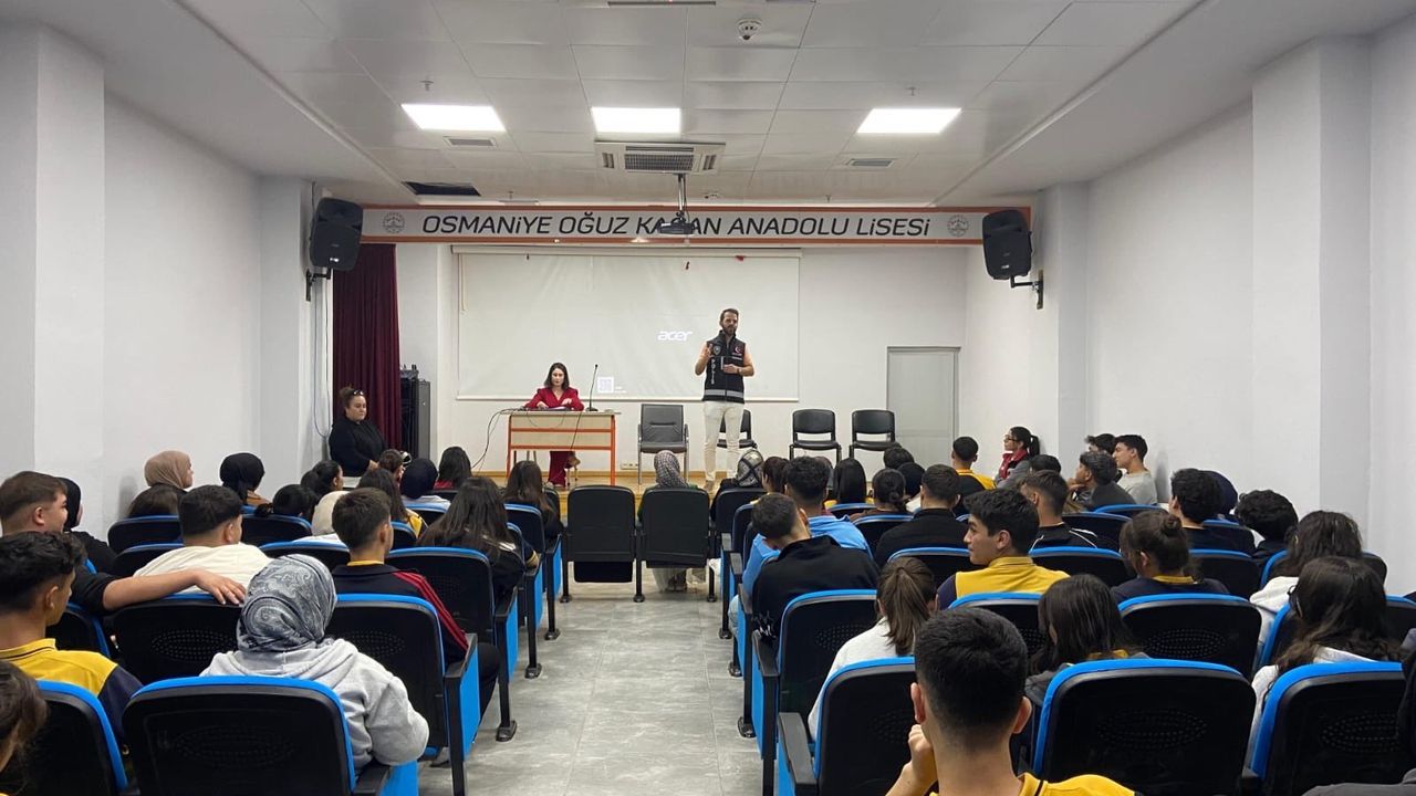Samet Aybaba Spor Lisesi, TOBB Osmaniye Fen Lisesi ve Oğuz Kağan Anadolu Lisesi’nde gerçekleştirilen bilgilendirme faaliyetlerinde, öğrenciler ve öğretmenler “Kişisel Güvenlik ve Suçtan Korunma Yöntemleri” konularında bilgilendirildi.