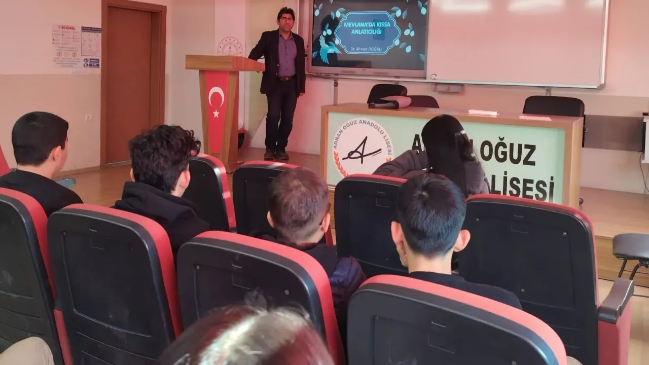 Programlar kapsamında Eğitimci, şair ve yazar Dr. Ahmet Doğru; Osmaniye Şehit Veli Demiryürek Bilim ve Sanat Merkezi (BİLSEM) ile Adnan Oğuz Anadolu Lisesi’nde düzenlenen konferanslarda öğrencilerle bir araya geldi. “Mevlâna’da Kıssa Anlatıcılığı” başlığıyla gerçekleştirilen söyleşilerde, Mesnevî’de yer alan kıssaların sembolik, eğitici ve dönüştürücü yönleri ele alındı.