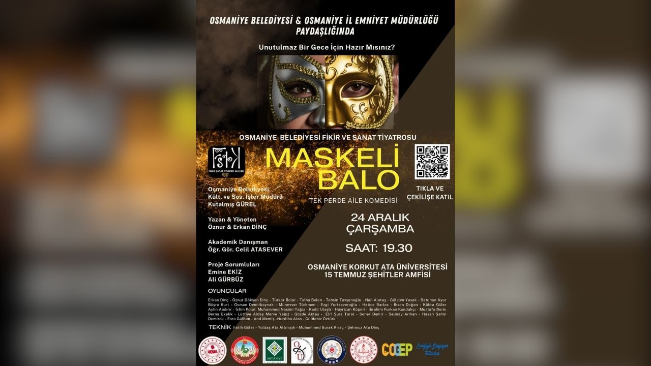 “Maskeli Balo”, eğlenceli kurgusu ve sıcak anlatımıyla her yaştan izleyiciye hitap eden bir aile komedisi olarak öne çıkıyor. Günlük hayattan kesitler sunan oyun, mizah yoluyla izleyiciyi içine çekerken, keyifli bir tiyatro deneyimi yaşatmayı amaçlıyor. Osmaniye Belediyesi Fikir ve Sanat Tiyatrosu oyuncularının sahneleyeceği eser, tiyatroya ilgi duyan vatandaşlar için kaçırılmayacak bir etkinlik olarak görülüyor.