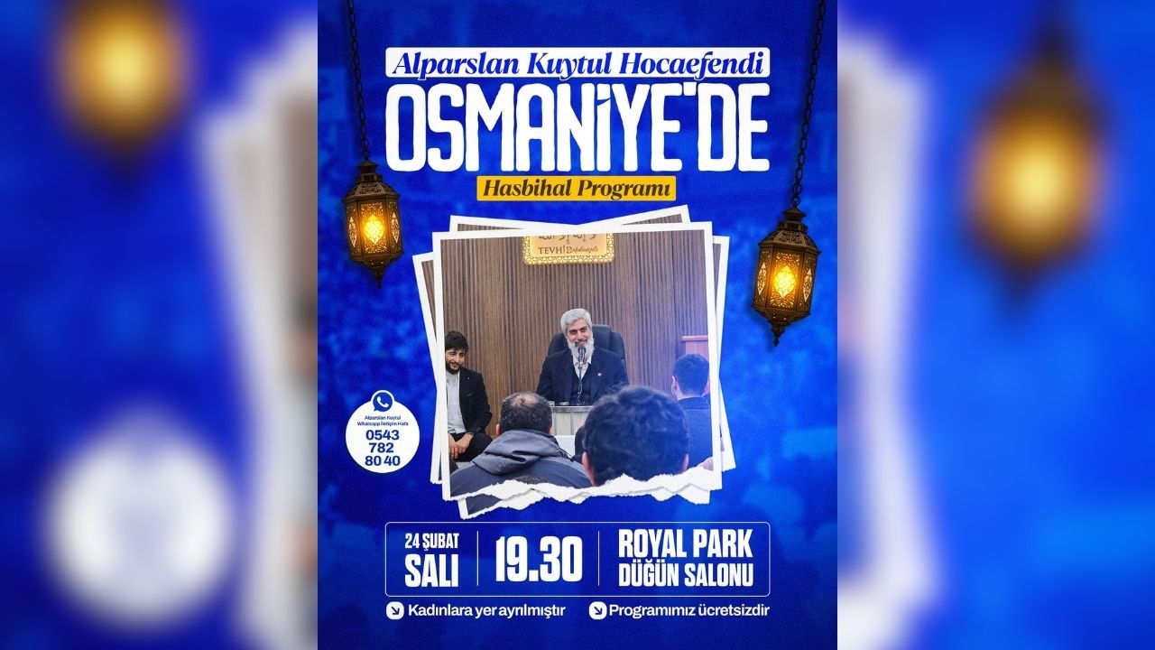 Alparslan Kuytul’un Osmaniye’de gerçekleştireceği hasbihal programı gerçekleşecek. 24 Şubat Salı akşamı yapılacak etkinlikte, güncel konuların yanı sıra dini ve toplumsal meselelerin ele alınması bekleniyor.