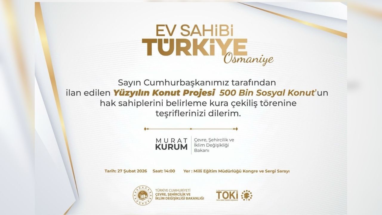 Hak sahiplerini belirleme kura töreni, Osmaniye’de merkezi bir noktada bulunan Milli Eğitim Müdürlüğü Kongre ve Sergi Sarayı’nda yapılacak. Saat 14.00’te başlayacak programda, başvuru sahipleri arasından konut almaya hak kazanan isimler noter huzurunda çekilecek kura ile belirlenecek.