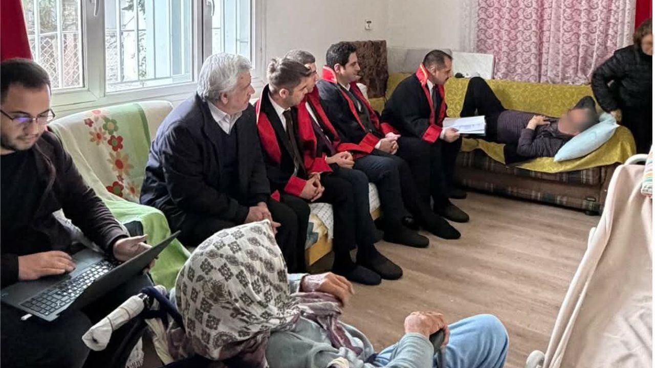 Mahkeme Başkanı, heyet üyeleri ve Cumhuriyet Savcısı’ndan oluşan ekip; katip ve mübaşirle birlikte vatandaşın ikametine giderek duruşmayı yerinde gerçekleştirdi. Resmi usullere uygun şekilde yapılan duruşmada, yatalak hastanın savunması yatağının başında alındı.