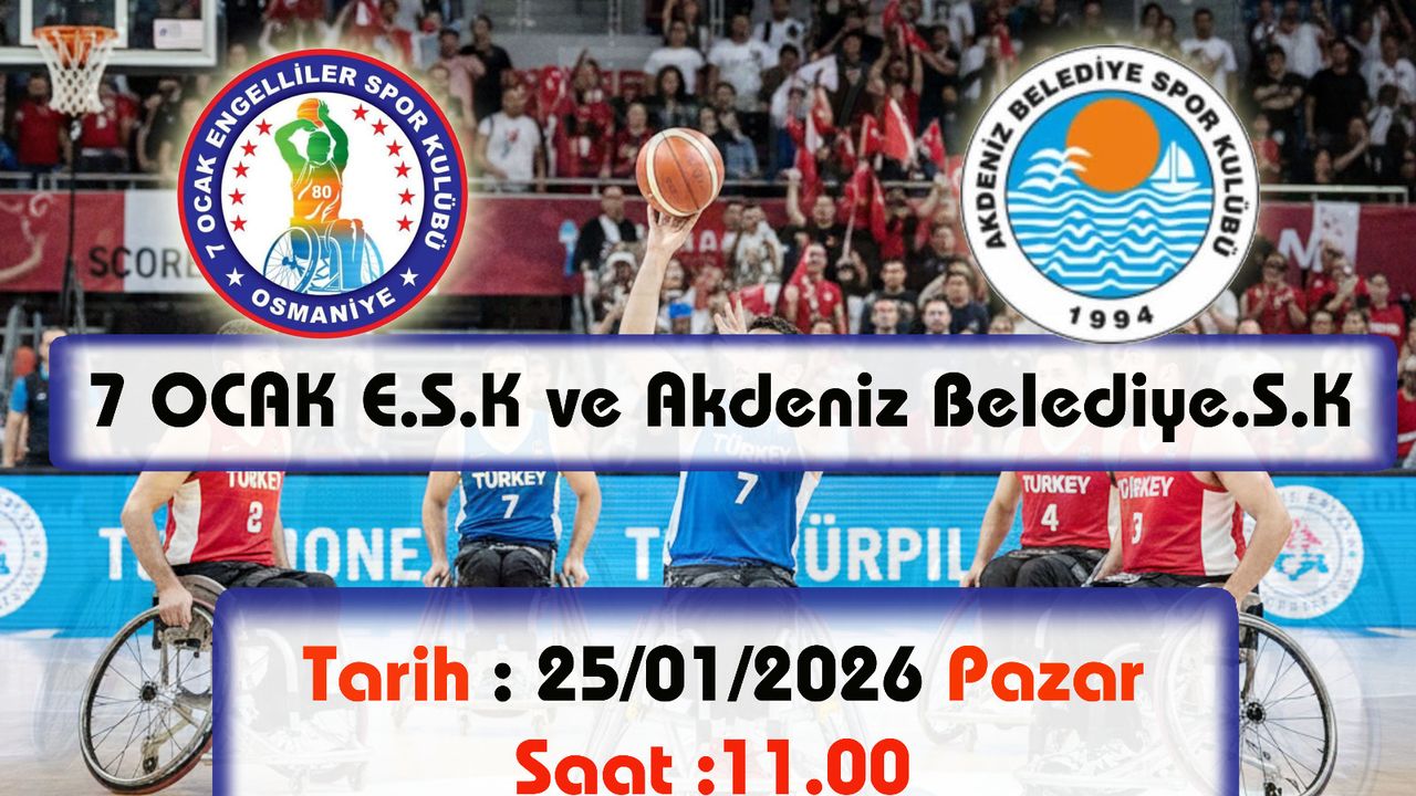 Engelliler Spor Kulübü (E.S.K) ve Akdeniz Belediye Spor Kulübü (Akdeniz Belediye S.K) arasında gerçekleşecek olan heyecan dolu müsabaka, 25 Ocak 2026 Pazar günü saat 11.00’de, Merkez Kapalı Spor Salonu’nda yapılacak.