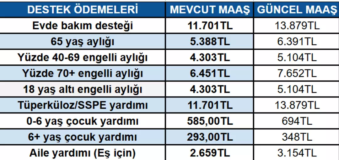 Yapılan hesaplamalara göre 65 yaş aylığı, engelli maaşları ve evde bakım parası zamlı tarifeden ödenecek.