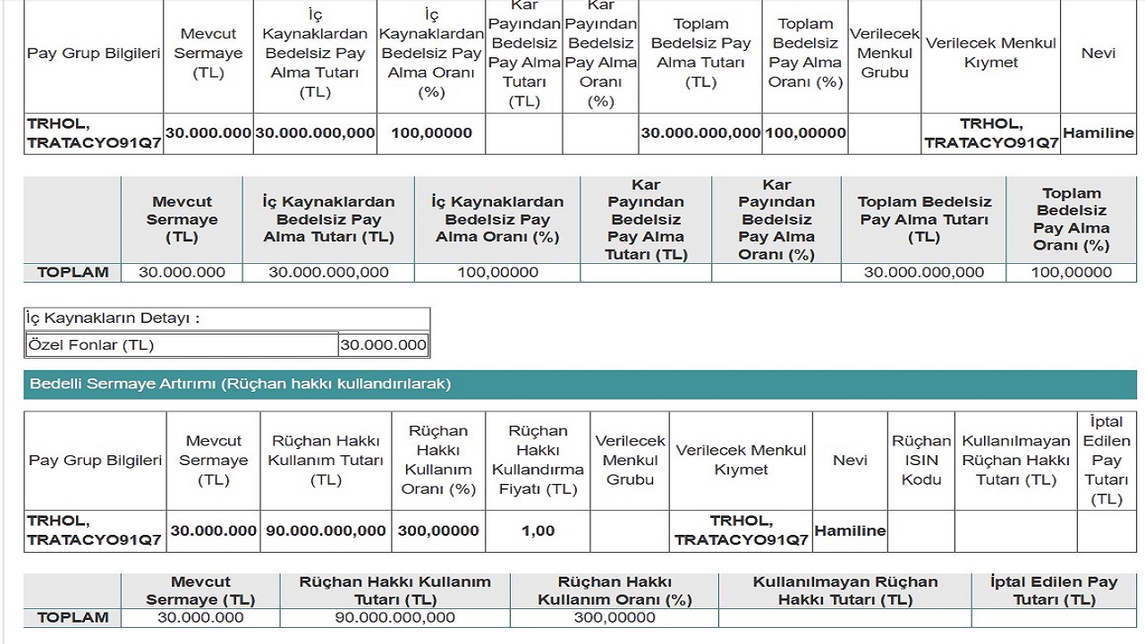 TRHOL Hisse Yüzde 300 Bedelli Sermaye Artıracak!