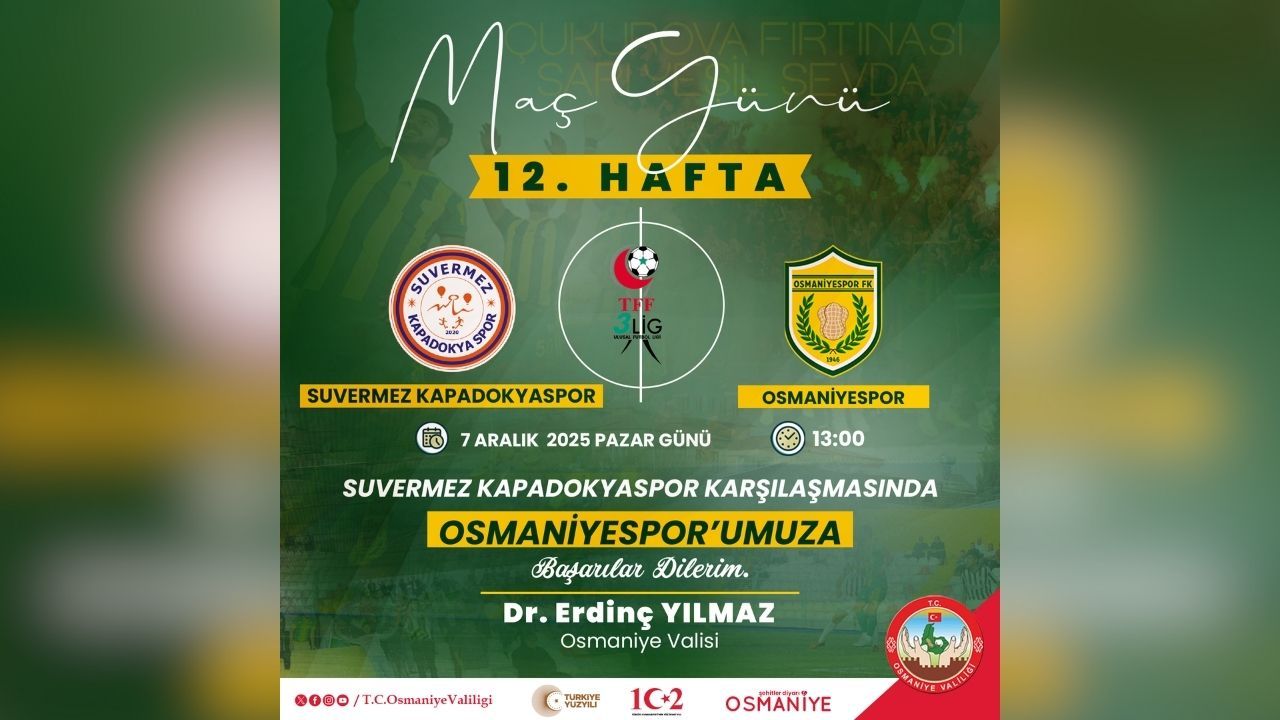 TFF 3. Lig'de mücadele eden temsilcimiz Osmaniyespor, ligin 12. Haftası kapsamında kritik bir deplasman maçına çıkıyor. Osmaniyespor, bugün 7 Aralık 2025 Pazar günü saat 13:00'te Suvermez Kapadokyaspor ile karşı karşıya gelecek. Osmaniye Valisi Dr. Erdinç Yılmaz, maç öncesinde yayımladığı mesajla takımımıza desteklerini iletti. Vali Yılmaz, "Suvermez Kapadokyaspor karşılaşmasında Osmaniyespor'umuza başarılar dilerim" ifadelerini kullandı. Osmaniyespor'un bu zorlu deplasmandan galibiyetle dönmesi, taraftarlar ve tüm şehir tarafından heyecanla bekleniyor.