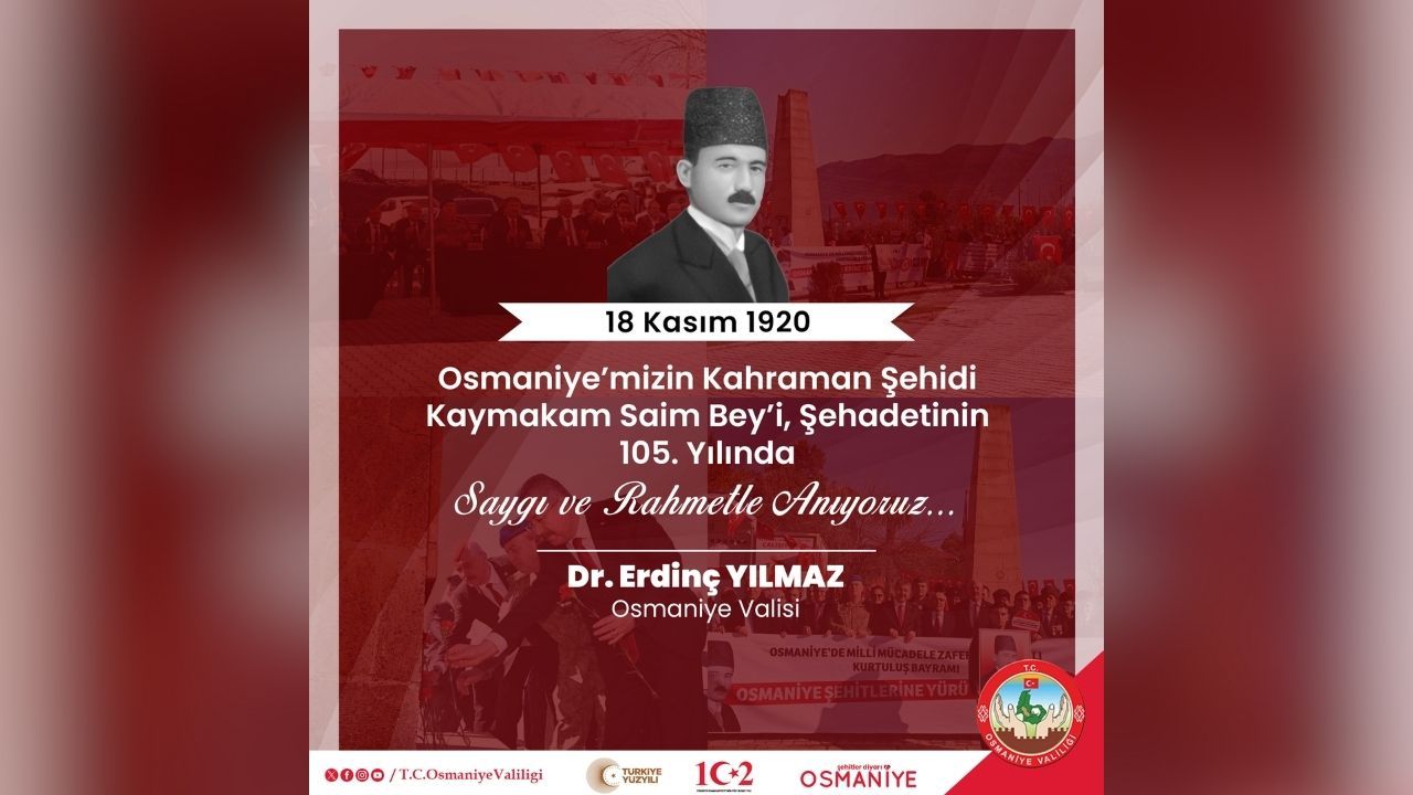 Osmaniye Valisi Dr. Erdinç Yılmaz, 18 Kasım 1920’de Osmaniye Cephesi’nde şehit düşen Millî Mücadele kahramanı Kaymakam Saim Bey’i yayımladığı mesajla andı. Vali Yılmaz, “Kaymakam Saim Bey'i şehadetinin 105. yılında rahmet, minnet ve şükranla anıyoruz.” ifadelerini kullandı.